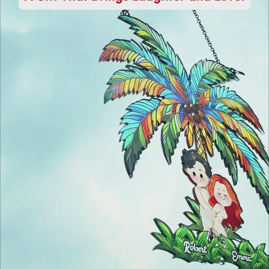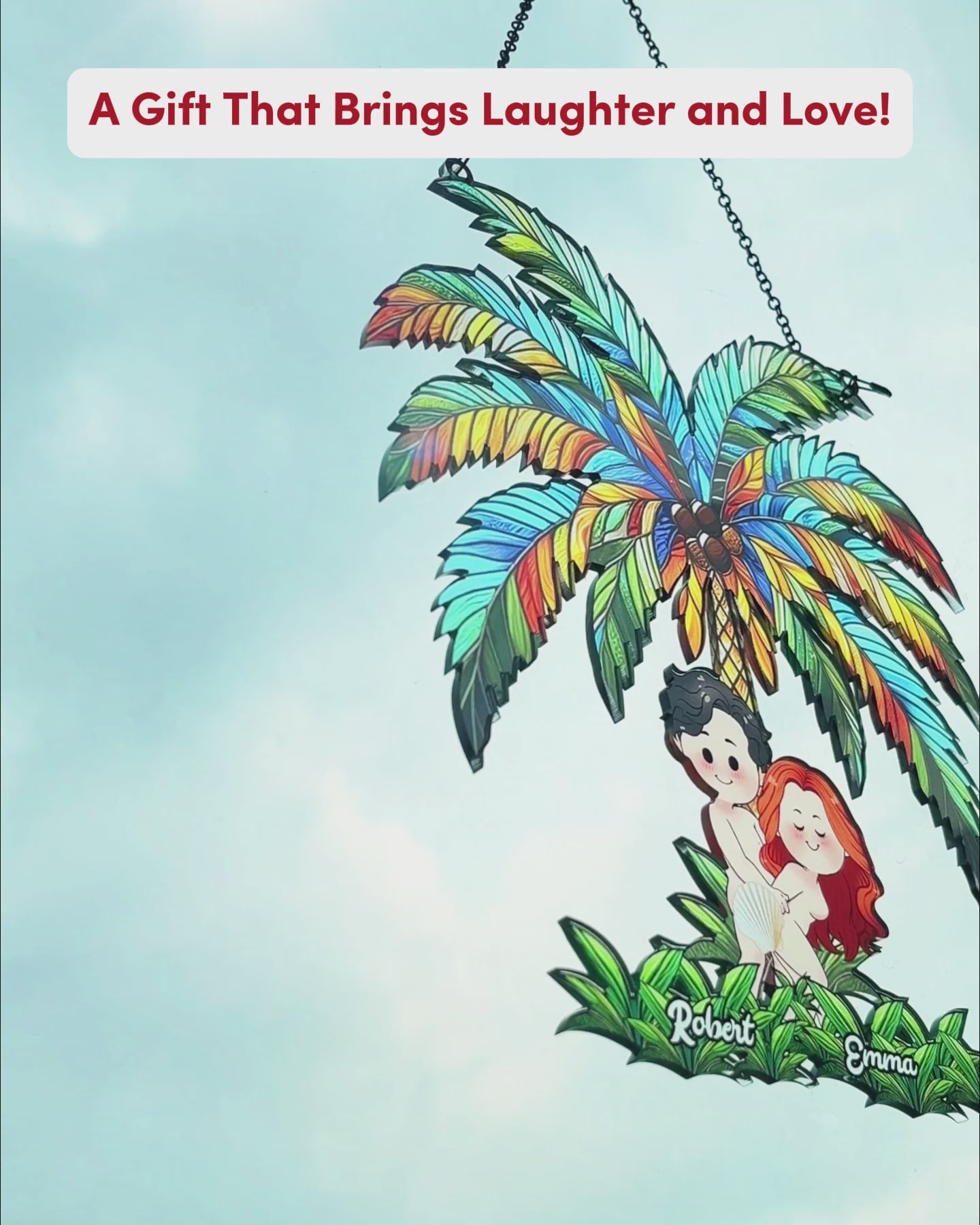 Funny Couple Under The Palm Tree - Personalized Couple Window Hanging Suncatcher Ornament